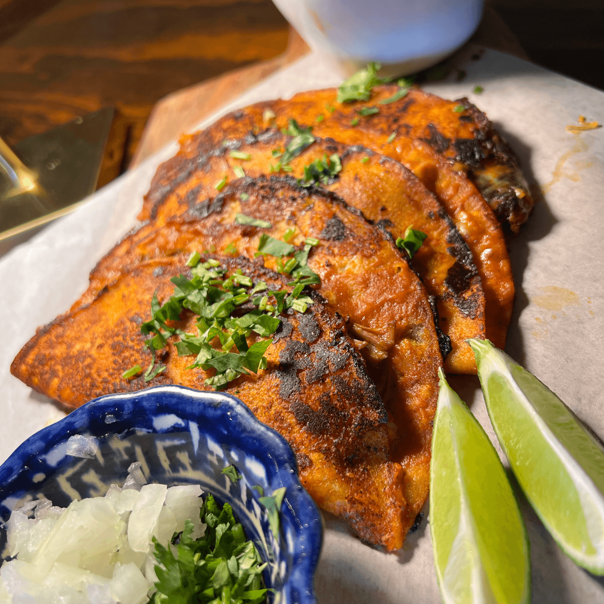 Savory rich crunchy cheese seasoned with consome, quesadilla, made with beef. Served with side of consome made to dip your Quesabirria.