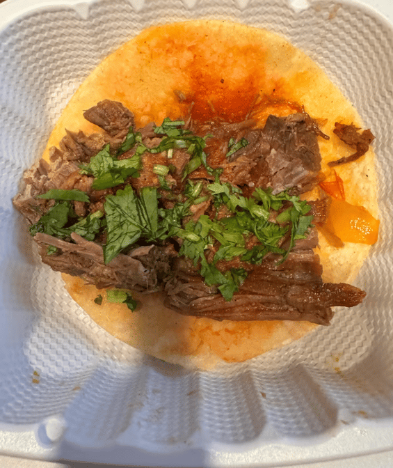 Tacos are made with two soft corn tortillas, your choice of meat and fresh salsa topped with cilantro.